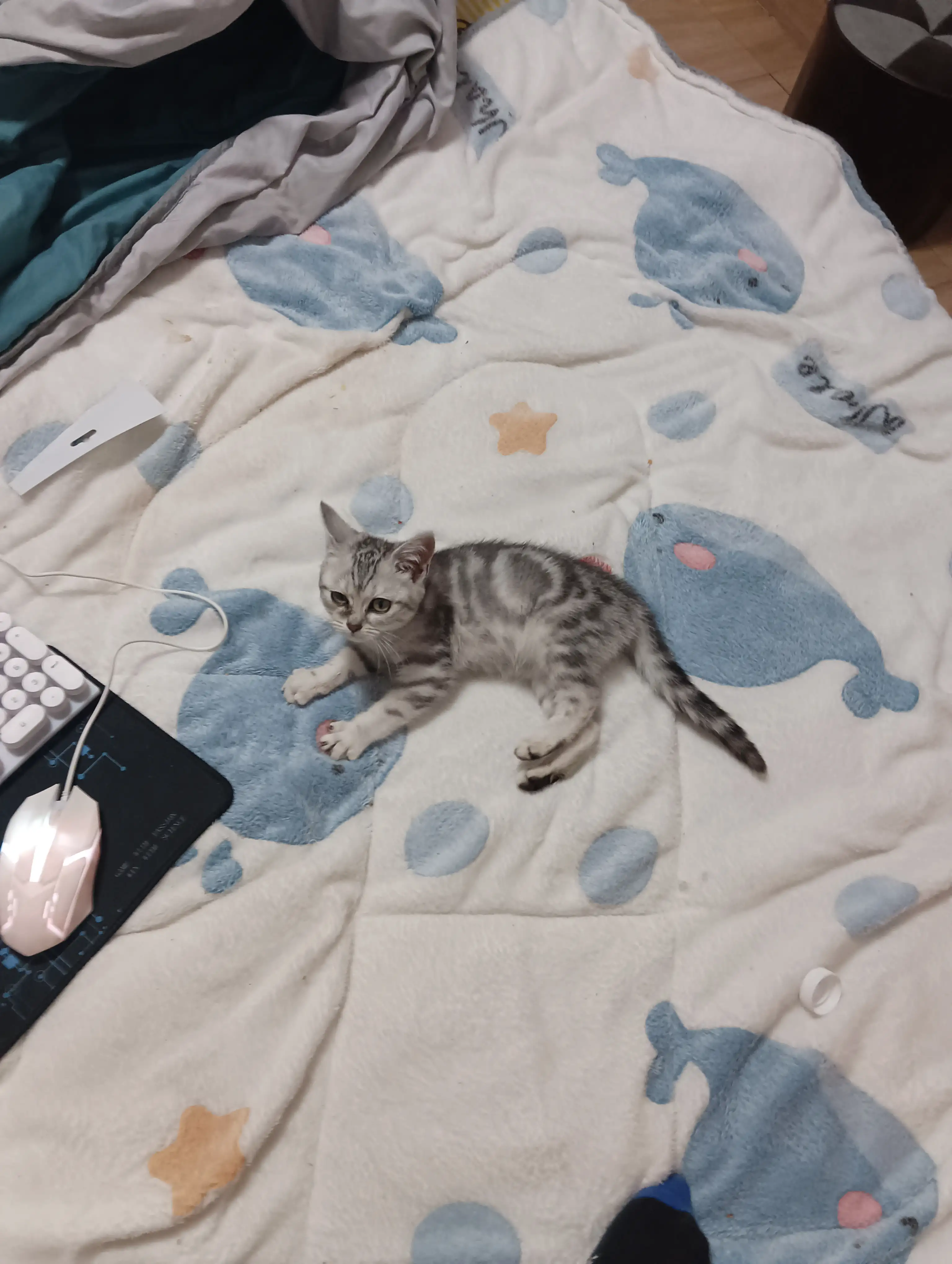 这一只小猫不是流浪的,而是去宠物店买的,是一只美短猫,见面的时候小小的,应该差不多七八个月,这一次我没有怎么求,可能是出于我爸对我的愧疚,给我买了一只小猫咪